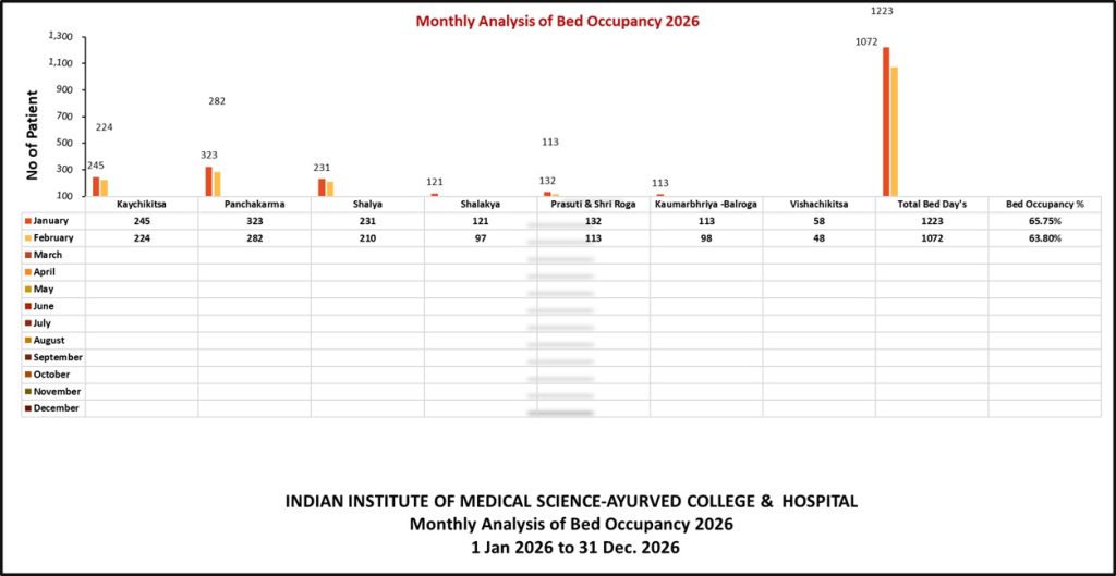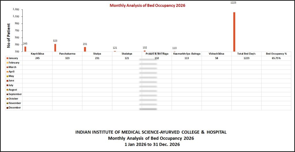 | Sr. No. | Month | Kaychikitsa | Panchakarma | Shalya | Shalakya | Prasuti & Shri Roga | Kaumarbhriya Balroga | Vishachikitsa | Total Bed Day's | Bed Occupancy % |