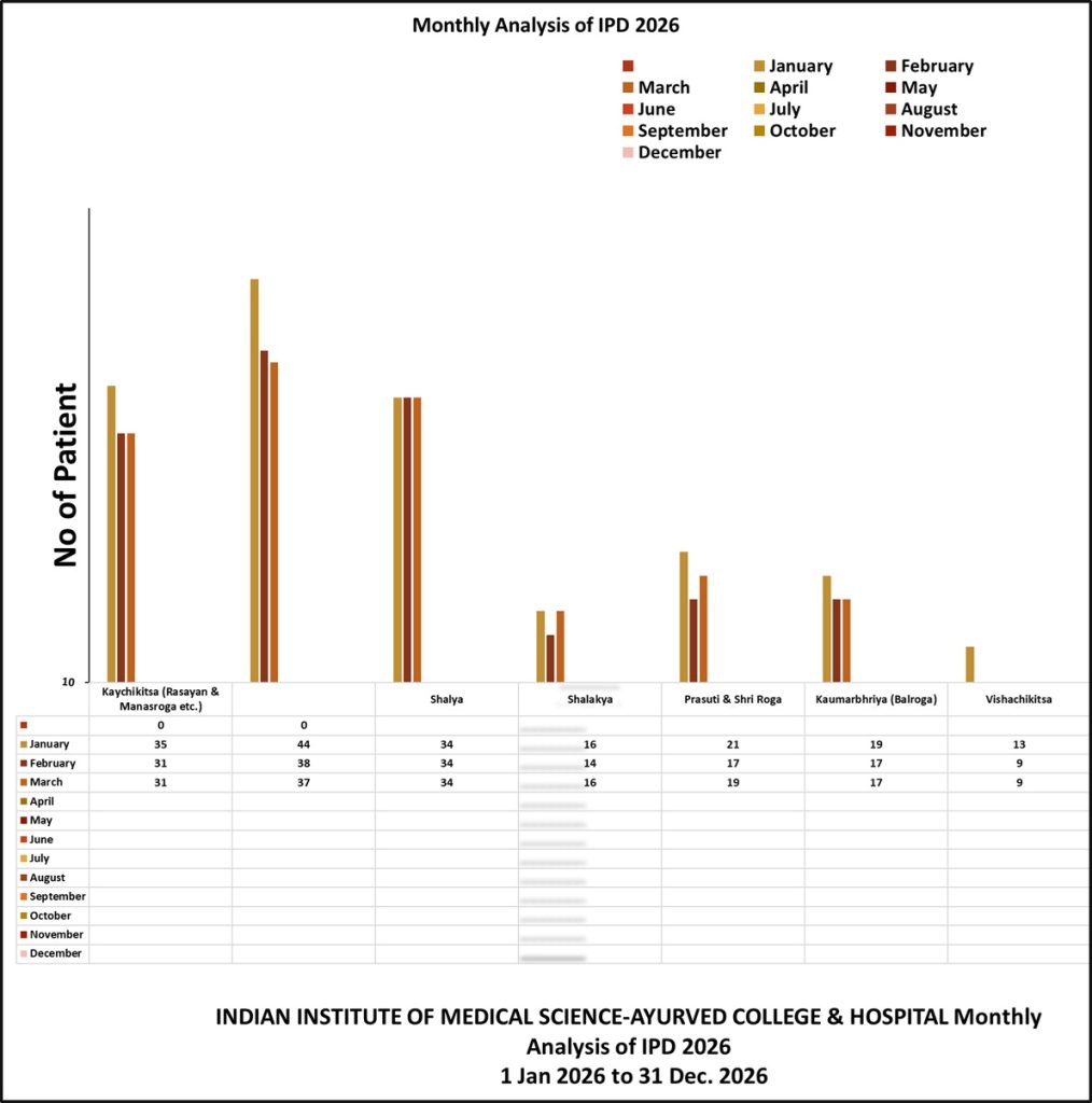 | Sr. No. | Month | Kaychikitsa (Rasayan & Manasroga etc.) | Shalya | Shalakya | Prasuti & Shri Roga | Kaumarbhriya (Balroga) | Vishachikitsa | Total | |