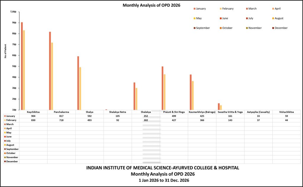 | Sr. No. | Month | Kaychikitsa | Panchakarma | Shalya | Shalakya Netra | Shalakya | Prasuti & Shri Roga | Kaumarbhriya | Swastha Vritta & Yoga | Aatyayika | Vishachikitsa | Total |